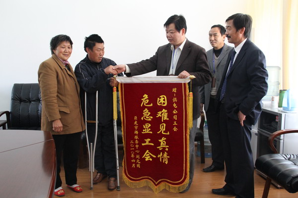 4月28日,巨龍農(nóng)貿(mào)市場特困職工劉元國拄著雙拐,在妻子陪伴下來公司送上錦旗,感謝干部職工的愛心捐助。去年初,下崗后在外謀生的劉元國因討要欠款發(fā)生車禍,腰部、腿部嚴重骨折,花費10萬余元,全家借錢度日。為讓劉家生活得到改善,春節(jié)前全公司發(fā)起獻愛心活動,共為劉元國募集錢款萬余元。(司宣)